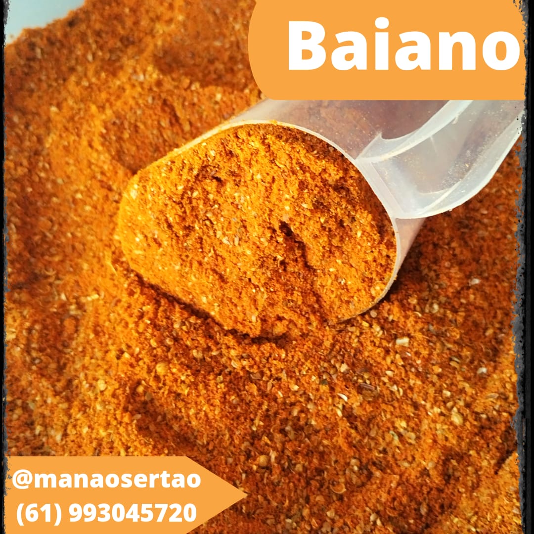 Tempero Baiano Maná" é um tempero que busca reproduzir a essência da culinária nordestina com um toque artesanal. A descrição destaca a forma como os ingredientes são processados para garantir o máximo de sabor e nutrientes.